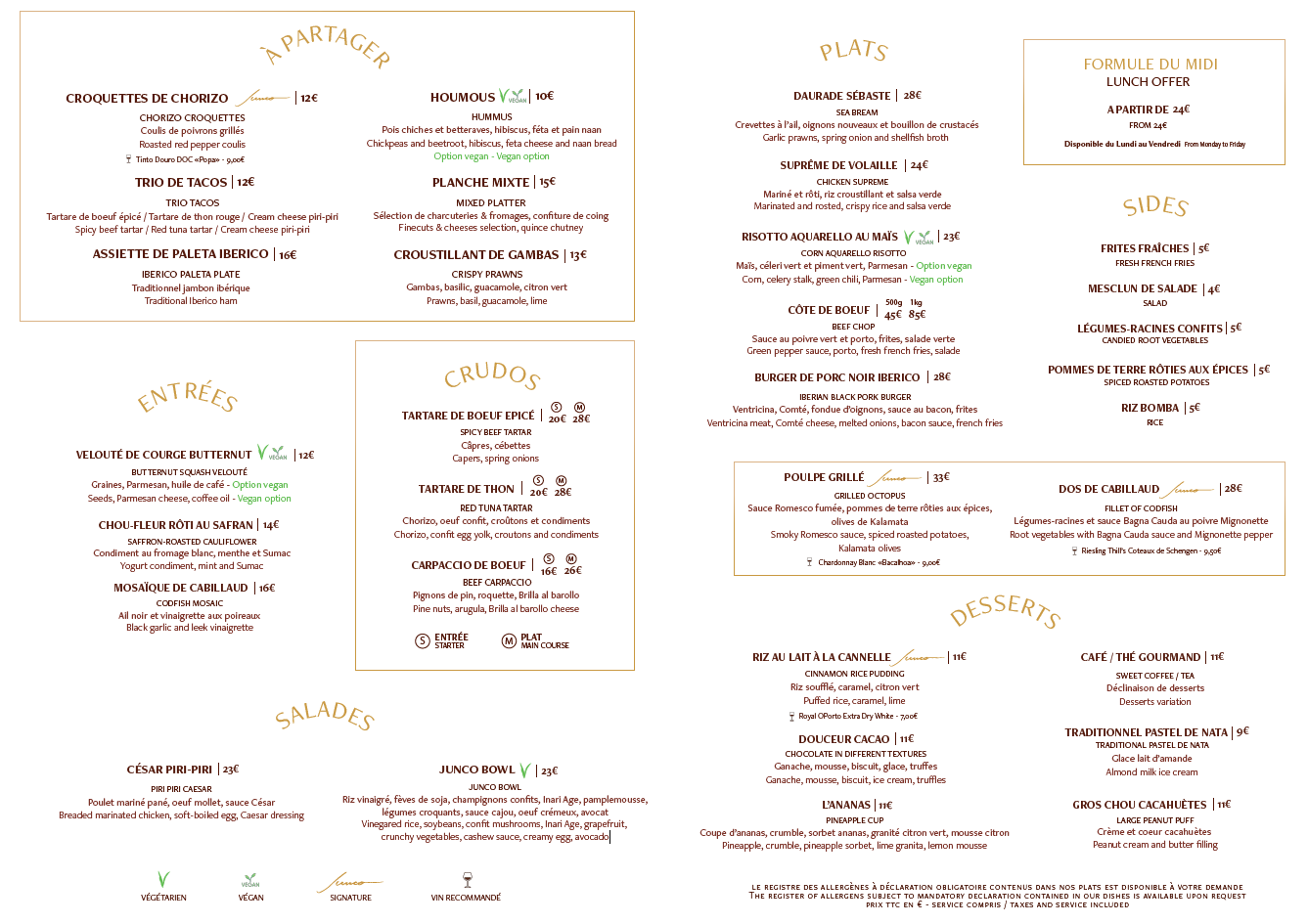 Que ce soit pour une pause déjeuner ou un dîner raffiné, Junco vous propose une cuisine idéale pour toutes les occasions. À midi, profitez de nos plats frais et savoureux, parfaits pour une escapade gourmande au cœur de la journée. Le soir, laissez-vous emporter par une atmosphère plus intime et découvrez nos créations culinaires préparées avec des produits de saison. Que vous veniez pour un repas convivial entre collègues ou pour savourer un dîner en toute tranquillité, chaque assiette est une invitation au voyage.